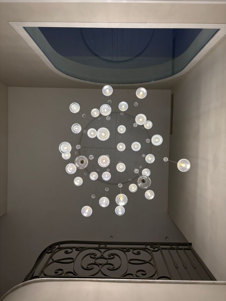 La hauteur de suspension a été ajustée avec soin — assez haute pour valoriser la verticalité du hall, assez basse pour rester fonctionnelle au quotidien. Les câbles ont été réglés, les pentes équilibrées, et la mise en service a fait l’objet d’une vérification complète : mise à la terre, fonctionnement de l’interrupteur, intensité lumineuse…